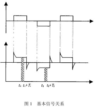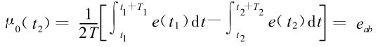②正負勵磁下的同相位采樣。圖1 是對應(yīng)低頻矩形波勵磁形式下的典型電勢信號形式,按上述關(guān)系在一個勵磁周期下 ,若假設(shè) t 1 和 t 2 點為工頻干擾的等效干擾點 , 且采樣寬度 T =T 1 =T 2 ,則 e ab 的基本算式為