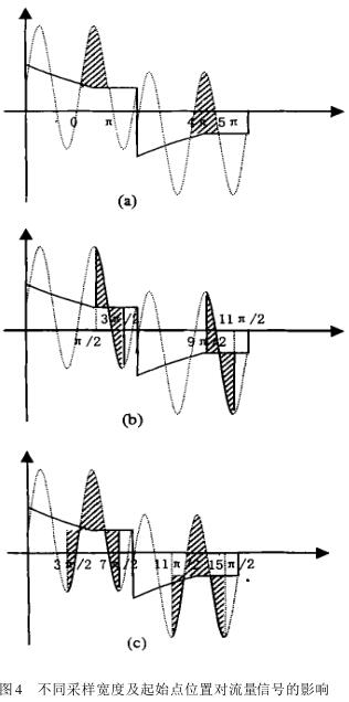 圖4(a)~ (c)直觀地描述了不同采樣寬度及采樣起始點位置對流量信號的影響 。設(shè)為信號采樣起始相位角,令為相位差 ;為采樣寬度誤差 都很小 ,可視為無窮小 。圖4(a)的采樣寬度為誤差為