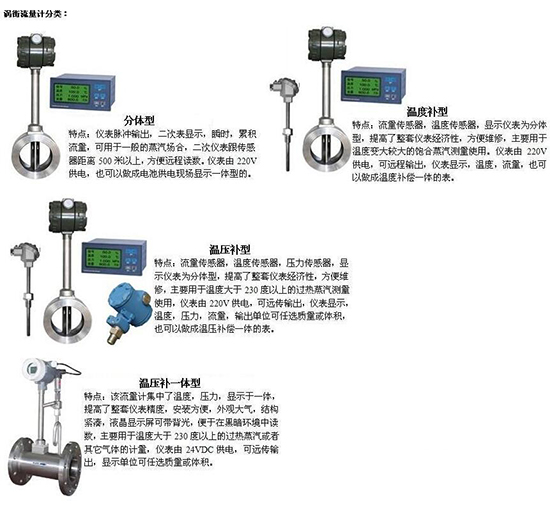 渦街流量計(jì)與現(xiàn)場(chǎng)顯示儀組合后,成為智能一體化流量計(jì),分別用于飽和蒸汽流量計(jì)量、過熱蒸汽流量計(jì)量、各種化學(xué)氣體流量計(jì)量和各種液體流量計(jì)量。