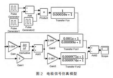 本文基于 Matlab 中 Siumlink 對電極信號進行仿真,勵磁方式為三值波勵磁,勵磁頻率 f=25Hz,傳感器參數(shù) D=40mm、Rx=88.8Ω、Lx=162mH,勵磁系統(tǒng)參數(shù) Ue=100V、穩(wěn)態(tài)電流 I0=200mA?;陔姌O測量回路搭建的仿真模型如圖 2 所示,圖中信號模塊 pulsGenerator 通過加法器、乘法器得到勵磁電流。由公式(1),在固定流速下感應(yīng)電勢與勵磁電流成正比,通過增加 Gain1 模塊得到感應(yīng)電勢信號。 對勵磁電流進行求導(dǎo)即經(jīng)模塊 Derivative 得到微分噪聲, 其中 Gain 值與 Lx 和 L1 相關(guān)。 感應(yīng)電勢與噪聲經(jīng)Add1 疊加之后得到電極信號 E1(t)。 scope 觀察輸出信號波形。仿真波形和真實波形如圖 3 所示。 將傳感器參數(shù)代入到勵磁電流穩(wěn)態(tài)調(diào)節(jié)時間公式中,得電流上升時間為 360μs,測得實際上升時間為 390μs,兩者相差不大,驗證了仿真模型的正確性。