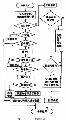 在HART通信中,地下污水流量計作為從設(shè)備進行通訊,所以這里的軟件設(shè)計只是針對于從設(shè)備。HART通信采用水平和垂直校驗的方法。當檢測到接收數(shù)據(jù)有差錯時,則等到主設(shè)備命令幀發(fā)完后,通知主設(shè)備數(shù)據(jù)接收有誤。主設(shè)備則重新發(fā)命令幀,從而保證通信的準確可靠。HART中斷子程序流程圖如圖6所示。由于HART通信為主從方式,HART幀中每個字節(jié)在物理層傳輸需要9ms左右,為了保證通訊的實時性,通訊程序采用串行口終端接收/發(fā)送。該中斷所要完成通信中的主要任務(wù),即接收和發(fā)送幀,幀的拆分和打包。