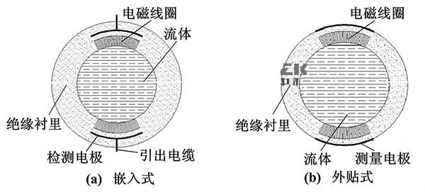 電極與被測流體通過絕緣管形成檢測電容,通過此電容來藕合流量信號。其主要的結構形式按照電極的安裝位置可以分為兩種:電極嵌人測量管的絕緣襯里內(nèi)部(嵌人式)、電極貼在測量管外部(外貼式)。嵌入式結構與普通冷卻塔冷卻水流量計結構相似,而外貼式大多是通過陶瓷表面金屬化技術將電極貼在測量管外。