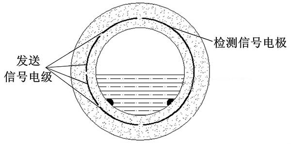 ③利用阻抗或信號衰減研制的非滿管冷卻塔冷卻水流量計。這種結構的非滿管冷卻塔冷卻水流量計是當前國內(nèi)研究的方向之一。其結構是流量管底部貼一對信號發(fā)射電極,在流量管中間貼信號接收電極。由于信號在流體中傳播會產(chǎn)生衰減,且傳播時間越長,衰減越多,因此通過信號接收電極接收到的信號衰減量即可得知液面高度;同時該電極還能測量流體切割磁感線產(chǎn)生的電動勢,以此達到測量非滿管流量的目的。阻抗式或信號衰減非滿管冷卻塔冷卻水流量計結構簡圖如圖5所示。