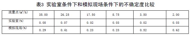 實(shí)驗(yàn)室條件下和模擬現(xiàn)場(chǎng)條件下的不確定度比較(表3)兩次結(jié)果可以看出,兩次實(shí)驗(yàn)各個(gè)流量點(diǎn)的不確定度差距非常大??梢?jiàn),化工污水流量計(jì)對(duì)安裝條件還是比較苛刻的。