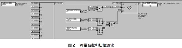 但是由于近期趨勢可能收集不到部分負(fù)荷段的相關(guān)數(shù)據(jù),在超出現(xiàn)有數(shù)據(jù)負(fù)荷的部分應(yīng)采取必要的補(bǔ)救措施,可以參考相同負(fù)荷運(yùn)行的另一臺余熱鍋爐的主蒸汽流量,以此來彌補(bǔ)現(xiàn)有數(shù)據(jù)的不足。為了保證數(shù)據(jù)切換的可靠性,切換條件要嚴(yán)謹(jǐn),現(xiàn)有函數(shù)的負(fù)荷下線上增加25MW與另外一臺的燃機(jī)負(fù)荷大于100MW。如此設(shè)置的好處是當(dāng)另一臺運(yùn)行機(jī)組突然故障或跳機(jī)時(shí)保證數(shù)據(jù)能及時(shí)切換到函數(shù)輸出,保證機(jī)組的安全運(yùn)行。具體操作見圖2。