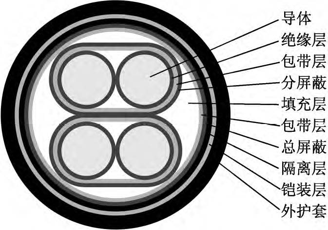 該新型電纜的結(jié)構(gòu)如圖1所示。導體為單股退火鍍錫軟銅線,以提高導體的導電性和防腐蝕性。在導體外繞包一層?。疲矗ň鬯姆蚁┌雽щ妿?,有利于降低導體和絕緣之間的摩擦起電噪音。絕緣采用材料較為純凈、介電常數(shù)較小、具有一定彈性的聚丙烯絕緣級材料,并采用擠壓式擠出,減小絕緣層與導體的間隙。采用對絞組作為信號傳輸線,由于在兩根傳輸線上感應的電壓接近相等,減小了電壓差值,提高了信號傳輸穩(wěn)定性;對絞組由兩種不同顏色絕緣線芯組成,相鄰線對對絞節(jié)距應不大于100mm。對絞分屏蔽組(即對對絞組進行分屏蔽,每對對絞組外繞包兩層聚酯帶和一層厚0.04mm鋁塑復合帶繞包,內(nèi)置一根7×0.26mm鍍錫銅絞線作引流線)有利于對不同對絞組之間信號串音的抑制和隔離。對絞分屏蔽組同心式絞合成纜,在對絞分屏蔽組間填充非吸濕性材料,以保證纜芯圓整。在成纜纜芯外繞包兩層聚酯帶,再采用鋁塑復合帶繞包,內(nèi)置鍍錫銅線作引流線,以提高電纜電磁屏蔽能力。總屏蔽層外擠包隔離層(隔離護套),隔離層采用絕緣級低密度聚乙烯材料。隔離層外采用鎧裝層,鎧裝材料為高導磁合金鋼帶,其為強磁材料,可將外來的磁通大部分限制在鎧裝層的外表面上(僅有少部分能進入被屏蔽的空間);鎧裝時對高導磁合金鋼帶采用縱包焊接,確保其形成一連續(xù)圓柱管;鎧裝層可提高電纜抗電磁干擾水平以及對電纜進行加強,減少電纜振動引起的電動勢。外護套采用藍色軟PVC(聚氯乙烯)護層級電纜材料擠包,實現(xiàn)電纜防護。