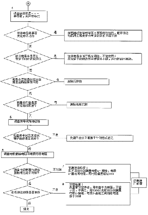 檢查流程圖*5項(xiàng)。信號(hào)回路絕緣下降會(huì)形成零點(diǎn)不穩(wěn)。信號(hào)回路絕緣下降的土要原因足,包極部位絕緣下降所引起的,但也不能排除信號(hào)電纜及其接線(xiàn)端子絕緣下降或破壞。因?yàn)橛袝r(shí)候現(xiàn)場(chǎng)環(huán)境十分嚴(yán)酷,稍一疏忽儀表蓋、導(dǎo)線(xiàn)連接處密封不慎,彌漫著潮氣酸霧或粉粒塵埃侵入儀表接線(xiàn)盒或電纜保護(hù)層,使絕緣卜降。信號(hào)回路絕緣電阻檢查分別按電纜側(cè)和流量傳感器側(cè)兩郵分進(jìn)行,用兆歐表測(cè)試。因信號(hào)電纜容易可先做。流量傳感器再分兩次進(jìn)行:充滿(mǎn)液體測(cè)黽電極表面接觸電阻和個(gè)管后測(cè)量,U極絕緣電阻。