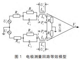 提出在硬件電路上加入模擬開關(guān), 干擾尖峰到來時(shí)斷開模擬開關(guān)避免干擾進(jìn)入后級(jí)電路,尖峰過去重新打開模擬開關(guān);K.Saito 等提出漂移校正法,先以高勵(lì)磁頻率進(jìn)行勵(lì)磁,在勵(lì)磁過程中插入低勵(lì)磁頻率提取用于漂移校正的非固定微分噪聲分量,但在插入的低勵(lì)磁頻率段漿液噪聲較大且很難將漿液噪聲與流量信號(hào)分離,此時(shí)的校正因子非單純的非固定噪聲分量,改進(jìn)措施是長時(shí)間取平均值得到穩(wěn)定因子。 傳統(tǒng)方法是同步采樣保持法,即在磁場穩(wěn)定階段采樣。 其他消除干擾的方法有設(shè)置干擾補(bǔ)償機(jī)構(gòu)、控制勵(lì)磁電流變化率減小干擾幅值、矩形波代替梯形波、希爾伯特黃變換結(jié)合傅里葉變換和程控增益技術(shù)等。經(jīng)上述對(duì)現(xiàn)有的文獻(xiàn)分析與總結(jié)可知, 當(dāng)前消除微分噪聲主要從信號(hào)處理方面入手,并未對(duì)影響噪聲的因素加以研究。 本文建立電極測量回路等效模型,給出仿真模型搭建、參數(shù)取值和仿真結(jié)果分析。