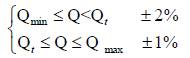 由圖2 可見,儀表系數(shù)可分為二段,即線性段和非線性段。在非線性段, 實際特性受軸承摩擦力、流體粘性阻力影響較大。當流量低于Qmin 時,儀表系數(shù)隨著流量迅速變化。壓力損失與流量的平方成正比關系。通常線性段約為工作段的2/3,其特性與渦輪結(jié)構(gòu)參數(shù)及流體粘性有關。隨流量的變化其儀表系數(shù)K 也會有一定的變化,但變化不大,通常將其變化幅度稱為流量計的計量準確度。對于產(chǎn)品設計而言,期望能將線性段的流量范圍拓展,一臺流量計能覆蓋同口徑的不同流量范圍,使得產(chǎn)品量程比變寬從而降低生產(chǎn)管理與生產(chǎn)批量加工成本。對于1.0 級的高壓機油流量計,以Qt(0.2Qmax)為分界流量點,將計量線性分為兩段,其中一段的*大允許誤差為±2%,而另一段的*大允許誤差為±1% 。按圖2 所示,通常每臺渦輪流量計均有較為相似特性曲線,若將可測量流量范圍做寬,就能在同口徑不同流量范圍進行分段截取,以實現(xiàn)一臺流量計能覆蓋同口徑的不同流量范圍。