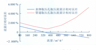 從以上數(shù)據(jù)表和曲線圖中可以看出:天燃氣流量計型號一定的情況下,用表體取壓孔取壓方式檢定流量計時流量計的線性度較好,用管道取壓孔取壓方式檢定流量計時流量計的線性度較差;流量測點相同的情況下,表體取壓孔取壓檢定方式的流量計誤差較小,管道取壓孔取壓檢定方式的流量計誤差較大;兩種取壓方式引起的誤差隨著流量的增大而逐漸增大,在流量為2?。梗埃埃恚常钑r兩者相差近6.2%,遠遠超出了流量計的準確度等級。所以,在天燃氣流量計的檢定過程中,應避免在流量計表體取壓孔以外的地方取壓進行檢定。