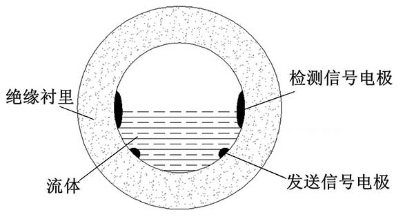 ③利用阻抗或信號(hào)衰減研制的非滿管管道式電磁流量計(jì)。這種結(jié)構(gòu)的非滿管管道式電磁流量計(jì)是當(dāng)前國(guó)內(nèi)研究的方向之一。其結(jié)構(gòu)是流量管底部貼一對(duì)信號(hào)發(fā)射電極,在流量管中間貼信號(hào)接收電極。由于信號(hào)在流體中傳播會(huì)產(chǎn)生衰減,且傳播時(shí)間越長(zhǎng),衰減越多,因此通過信號(hào)接收電極接收到的信號(hào)衰減量即可得知液面高度;同時(shí)該電極還能測(cè)量流體切割磁感線產(chǎn)生的電動(dòng)勢(shì),以此達(dá)到測(cè)量非滿管流量的目的。阻抗式或信號(hào)衰減非滿管管道式電磁流量計(jì)結(jié)構(gòu)簡(jiǎn)圖如圖5所示。