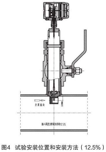 根據(jù)中華人民共和國(guó)機(jī)械行業(yè)標(biāo)準(zhǔn):JB/T9249-2015《煙氣流量計(jì)》進(jìn)行插入式煙氣流量計(jì)的研制與設(shè)計(jì)。在試驗(yàn)過(guò)程中,因?yàn)槔碚撗芯坎怀浞郑偌由辖?jīng)驗(yàn)不足,采用插入深度是按照以往其它產(chǎn)品(插入式電磁流量計(jì))的經(jīng)驗(yàn),以插入深度為現(xiàn)場(chǎng)管道內(nèi)徑的 12.5% 進(jìn)行試驗(yàn),其對(duì)介質(zhì)流量的檢測(cè)值與同種規(guī)格管道法蘭式結(jié)構(gòu)的煙氣流量計(jì)進(jìn)行比較,偏差值較大、儀表準(zhǔn)確度無(wú)法滿(mǎn)足設(shè)計(jì)要求。試驗(yàn)安裝位置和安裝方法如圖 4 所示。