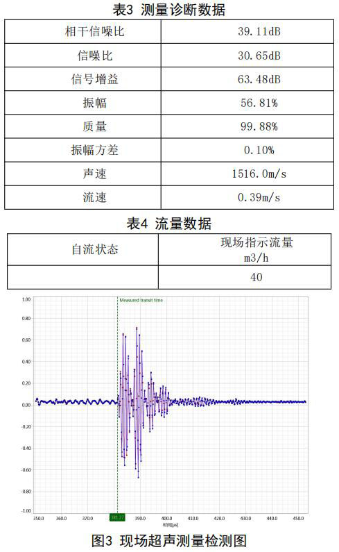 在高負(fù)荷段采用泵送補(bǔ)給水狀態(tài):測(cè)試時(shí)間 2018年10月11日,采用德國(guó)FLUEX高精度外夾式超 聲波流量計(jì)作為標(biāo)準(zhǔn)流量計(jì),測(cè)量基礎(chǔ)數(shù)據(jù):管道 外徑276.93mm,管壁厚度12.40mm,采用兩聲程169mm傳感器安裝距離,通過(guò)對(duì)超聲波流量計(jì)信號(hào) 分析與診斷(數(shù)據(jù)見表1、表2和圖2),診斷數(shù)據(jù) 提示標(biāo)準(zhǔn)超聲波流量計(jì)測(cè)量狀況佳,檢測(cè)開始,啟 動(dòng)補(bǔ)給水泵,運(yùn)行一段時(shí)間流量穩(wěn)定后,測(cè)量結(jié)果 如下: