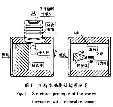 不斷流渦街同樣是以卡門渦街原理為依據(jù)測量流體流速的,但不斷流渦街表體已經(jīng)在結(jié)構(gòu)上有了質(zhì)的改變。如圖1所示,它將普通渦街單一的信號檢測傳感頭改變?yōu)閭髁U與信號檢測傳感頭兩部分,并通過隔離裝置完全隔離。當(dāng)表體中流過流體并產(chǎn)生漩渦時(shí),由傳力桿檢測漩渦的變化,并以力的形式傳遞給信號檢測傳感頭,完成了力信號到電信號的轉(zhuǎn)換過程。雖然傳力桿與流體直接接觸,但其本身只是進(jìn)行力傳輸?shù)母軛U,因此,只對外形尺寸及鋼材選擇上具有要求。而信號檢測傳感頭是通過隔離裝置與流體完全密閉隔離的,再加上隔離裝置本身具有的散熱功能,使得信號檢測傳感頭的使用溫度要遠(yuǎn)遠(yuǎn)低于流體的實(shí)際溫度,從而有效地提高了普通信號檢測傳感頭的可測介質(zhì)溫度。同時(shí),不斷流渦街在進(jìn)行維修更換信號檢測傳感頭時(shí),并不影響工藝管道內(nèi)流體的流動,真正實(shí)現(xiàn)了信號檢測傳感頭的不斷流拆裝維護(hù)。