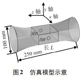 使用 Pro /E 軟件建立三維幾何模型,導(dǎo)入 COMSOL 軟件進行有限元求解。仿真模型如圖 2 所示,電極連線為x 軸,連線中點為坐標(biāo)原點,流體運動方向為 z 軸,傳感器管道口徑為 DN100,總長250 mm。異徑管部分初始結(jié)構(gòu)尺寸 L = 80 mm,D = 80 mm,H = 40 mm,圓形電極半徑為17 mm,伸出絕緣襯里的*大距離為 1. 5 mm。