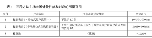 本規(guī)范包含三種校準(zhǔn)方法,分別為標(biāo)準(zhǔn)表法 1(外夾式超聲流量計(jì))、標(biāo)準(zhǔn)表法 2(串聯(lián)移動(dòng)式在線校準(zhǔn)裝置)和稱重法,編制組對(duì)每種方法進(jìn)行了大量的實(shí)驗(yàn),并積極與管道式流量計(jì)生產(chǎn)廠家及用戶溝通探討,積累了豐富的經(jīng)驗(yàn),獲得了大量的實(shí)驗(yàn)數(shù)據(jù),*終確定三種方法的主標(biāo)準(zhǔn)器計(jì)量性能和對(duì)應(yīng)的測(cè)量范圍,如表 1 所示。