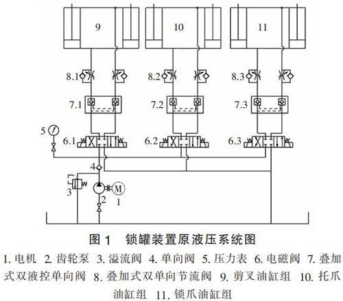 氪氣流量計(jì)原液壓系統(tǒng)圖如圖 1 所示。 通過分析圖 1 發(fā)現(xiàn),原液壓系統(tǒng)中剪叉油缸組、托爪油缸組及鎖爪油缸組并聯(lián)安裝,并均由齒輪泵供油,該系統(tǒng)設(shè)計(jì)簡單,液壓元件選擇不夠合理,工作效率低,電機(jī)發(fā)熱大,主要存在的問題: