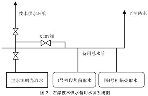 技術供水系統(tǒng)設有主、備用水源。主水源是蝸殼取水,作為機組技術供水的主用水源。備用水源有兩個,一個是設在 1 號機段的壩前取水,取水口高程為 145m,另一個是同 4 號機組蝸殼取水共用取水口的蝸殼備用取水。兩路備用水源均接到備用總水管,并通過 X207 閥分別與各臺機組的技術供水系統(tǒng)相連通(見圖 2)。