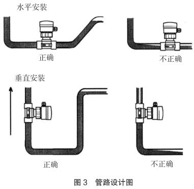 現(xiàn)場安裝時應注意遠離可能對其產(chǎn)生干擾的大型設備,防止長期的熱輻射和其他如磁場直射等環(huán)境影響。為確保高測量精度和較好的零點穩(wěn)定性,進行校正前,高壓電磁流量計應裝入工藝介質(zhì)中至少 24 小時電極鈍化。安裝的管路設計應確保管道始終充滿流體,防止測量誤差,管路設計圖見圖 3。