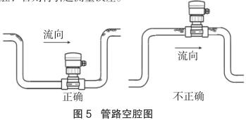 測量流向取決于高壓電磁流量計的安裝方位,將高壓電磁流量計在接頭上旋轉 180 度即可反向。正流向時,高壓電磁流量計的突耳應在上游方向。流量顯示總是正的,而累加器可以根據(jù)流向增加或者減少。安裝中確認管路設計不允許在介質(zhì)中產(chǎn)生氣泡或空腔,否則將引起測量誤差(見圖 5)。