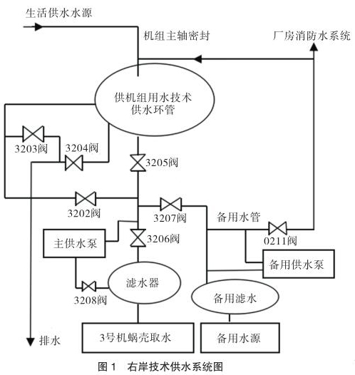 大化電廠技術供水包括右岸和左岸供水,本文以右岸 3 號機技術供水系統(tǒng)增設帶現(xiàn)場顯示高壓電磁流量計技術改造方案為例進行分析說明。右岸技術供水系統(tǒng)(見圖 1)由各機組單元蝸殼取水主水源、濾水器、主供水泵、正反向切換閥(3202 閥與 3204 閥開為反向取水,3203 閥與 3205閥開為正向取水,運行時只開其中一種)、備用水源、備用濾水器、備用供水泵和備用總水管構成一個整體,并通過 0211 閥與廠房消防水系統(tǒng)相連接,可通過主水源自流供水、主水源水泵增壓供水、備用水源自流供水、備用水源水泵增壓供水等不同供水方式向機組推力軸承冷卻器和發(fā)導軸承冷卻器、水導軸承冷卻器、發(fā)電機空氣冷卻器提供冷卻水源。機組技術供水正常運行采用單元蝸殼取水的供水方式運行,以備用水源供水為輔。機組主軸密封用水分別取自生活供水水源和技術供水備用總管水源,向機組大軸提供可調(diào)水壓端面密封水源。在現(xiàn)場配置一個技術供水現(xiàn)地單元柜,實現(xiàn)對機組技術供水系統(tǒng)設備自動控制、故障保護及報警。柜內(nèi)配置可編程 PLC 控制系統(tǒng),電控柜對主供增壓泵、3202 至 3208 電動碟閥進行流程控制。