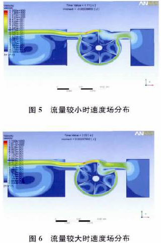 (1)數(shù)值仿真結果與物理實驗結果基本一致,當流速低于啟動排量,渦輪未啟動時,流體沿葉片做繞角運動,葉片兩側壓力相等,葉片不轉動;當流速高于啟動排量,渦輪轉動時,流體在腔內產生旋渦,造成葉片兩邊壓差,從而造成葉片轉動。