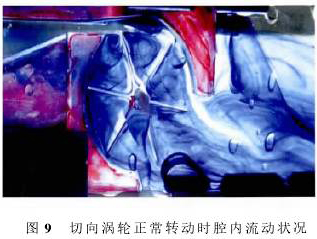 圖9記錄的是切向渦輪正常轉動時的流場,圖9中水從左向右流動,實驗時水速較快(1m3/d),渦輪葉片順時針轉動。水速變大后,擾動變大,不再是無旋繞角流動,腔體1中流體形成一個運動的旋渦,導致腔內壓強分布不再對稱,產生壓差,致使渦輪葉片轉動,旋渦在隨葉片運動到腔體2中時逐漸耗散消失。數(shù)值仿真的計算結果與物理實驗的結果基本一致。