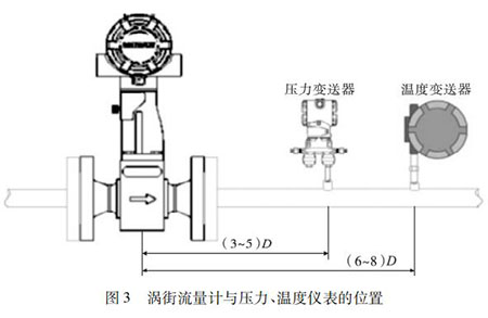 蒸汽流量計(jì)的口徑如果與工藝管道相同,不能滿足流量?jī)x表要求時(shí),或者在此流速下測(cè)量準(zhǔn)確度不能保證時(shí),需要縮小儀表口徑,從而提高管內(nèi)流速,保證測(cè)量精度。上下游必須有足夠的直管段,若傳感器安裝點(diǎn)的上游在同一平面上有 2 個(gè) 90°彎頭時(shí),上游直管段≥25D,下游直管段≥5D。根據(jù)測(cè)量的需要,需在蒸汽流量計(jì)附近測(cè)量壓力和溫度時(shí),測(cè)壓點(diǎn)應(yīng)在傳感器下游的( 3 ~ 5) D 處,測(cè)溫點(diǎn)應(yīng)在傳感器下游的( 6 ~ 8) D 處,如圖 3 所示。