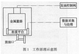 本裝置采用容積法和稱(chēng)重法相結(jié)合的工作原理。對(duì)于質(zhì)量流量計(jì),采用稱(chēng)量法直接比較,確定流量計(jì)的誤差。上裝放油閥防溢出控制系統(tǒng),采用液位動(dòng)態(tài)監(jiān)視,一旦超過(guò)容器安全液位高度,即可切斷發(fā)油動(dòng)力。在運(yùn)輸防震或非測(cè)量狀態(tài)時(shí),對(duì)秤進(jìn)行與稱(chēng)重容器的脫離操作,保證稱(chēng)重的可靠性。在稱(chēng)重狀態(tài)時(shí),需要對(duì)枰進(jìn)行調(diào)平和清零,此部分采用動(dòng)態(tài)水平的方式進(jìn)行,即以水平位一致的方法調(diào)整稱(chēng)重平臺(tái)。工作原理如圖1所示。