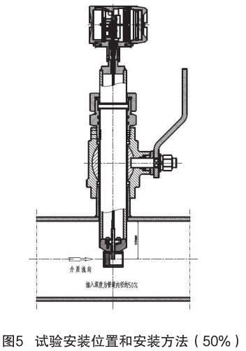 對(duì)插入式渦街流量計(jì)和插入式電磁流量計(jì)的結(jié)構(gòu)原理進(jìn)行分析,插入式電磁流量計(jì)的信號(hào)采集點(diǎn)在標(biāo)校管道內(nèi)12.5% 為宜,因它屬電磁類流量計(jì),而流量計(jì)是根據(jù)“卡門(mén)渦街”原理進(jìn)行測(cè)量管道內(nèi)流量,根據(jù)標(biāo)校管道內(nèi)層流和湍流的分析,以及流量計(jì)獨(dú)特的探頭結(jié)構(gòu)形式,確定煙氣流量計(jì)的插入深度為標(biāo)校管道內(nèi) 50%,試驗(yàn)安裝位置和安裝方法如圖 5 所示。