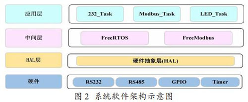 Modbus 通訊模塊的軟件架構(gòu)如圖 2 所示,分為硬件層、硬件抽象層,中間層和應(yīng)用層。中間層包括一個(gè)實(shí)時(shí)操作系統(tǒng)FreeRTOS 和一個(gè)針對(duì)嵌入式環(huán)境開發(fā)的輕量級(jí) Modbus 協(xié)議庫(kù)Freemodbus。在應(yīng)用層,主要?jiǎng)?chuàng)建了三個(gè)任務(wù),232_Task 負(fù)責(zé)讀 取和解析流量計(jì)表頭輸出的文本信息,Modbus_Task 負(fù)責(zé)存儲(chǔ) 解析后的流量計(jì)數(shù)據(jù)到 Modbus 寄存器表,以及以 Modbus 協(xié)議與取水監(jiān)測(cè)設(shè)備通信,LED_Task 是一個(gè)輔助任務(wù),主要用來(lái)提示程序運(yùn)行狀態(tài)。