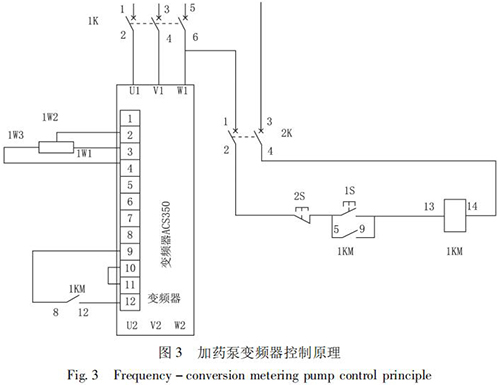 STD - Ⅲ型浮選工藝參數(shù)自動測控系統(tǒng)通過雙膜盒差壓計測量原礦漿濃度; 采用管道式流量計測量原礦漿流量,由 PLC 計算出入浮干煤泥量和藥劑的瞬時添加量,用變頻式計量泵完成浮選藥劑的添加。通過上位機還可以打印小時、班、天及月的運行數(shù)據(jù),更加有利于生產(chǎn)管理及技術(shù)分析,藥劑自動原理如圖 2 所示,k1、k2、k3 是計算修正參數(shù)。以 PID 算法為核心,通過優(yōu)化控制程序計算出藥劑給定量,在捕收劑和起泡劑管道上分別安裝藥劑測量裝置,用于檢測藥劑的添加量。當藥劑測量值小于藥劑給定量時,PID 輸出增大,反之則減小。加藥泵變頻器控制原理如圖 3 所示。