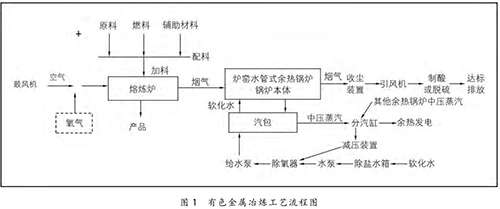 在有色金屬冶煉過(guò)程中,將原料、燃料和輔助材料根據(jù)熱平衡原理按一定比例進(jìn)行配料,配料后的物料與空氣或高含氧的混合空氣在熔煉爐中進(jìn)行氧化或還原反應(yīng),熔煉出有色金屬產(chǎn)品。同時(shí),在熔煉過(guò)程中會(huì)產(chǎn)生大量的高溫?zé)煔猓?1200 ℃ 左右),高溫?zé)煔饨?jīng)過(guò)余熱鍋爐時(shí),與余熱鍋爐水側(cè)的軟化水進(jìn)行熱量交換,煙溫迅速降至 250℃ 以下,再經(jīng)收塵、制酸或脫硫裝置進(jìn)一步收塵、降溫、凈化,*終達(dá)標(biāo)排放。余熱鍋爐水側(cè)的軟化水經(jīng)熱量交換后產(chǎn)生中壓飽和蒸汽(4 MPa 左右),送至余熱發(fā)電機(jī)組發(fā)電。具體的工藝流程如圖 1 所示。