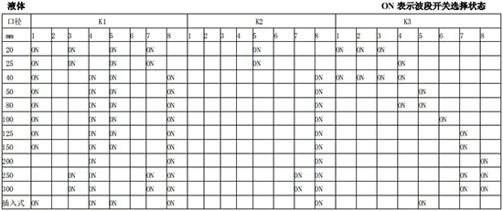 以上表值僅供參考,實際使用中因液體粘度和氣體密度不同應(yīng)在此值附近調(diào)整,頻率低時可將 K3 向大口徑方向調(diào)一至三檔。頻率高時可將 K2 向小口徑方向調(diào)一至三檔。