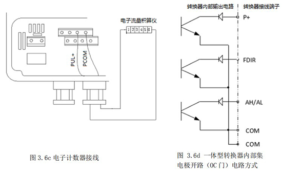 1.4.5 頻率(脈沖)、上下限報(bào)警、流向標(biāo)示等輸出均為集電極開路的電平輸出信號。