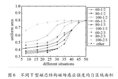 仿真實驗證明在有限的空間下,修改T磁芯的不同參數(shù),可以增加流量計測量區(qū)域內(nèi)部的磁場分布情況,也可以適當?shù)恼{(diào)整流量計測量區(qū)域中的磁場強度與均勻度,根據(jù)生產(chǎn)測井中的實際工況,改變井水流量計的T磁芯參數(shù)獲得設(shè)計參數(shù)。